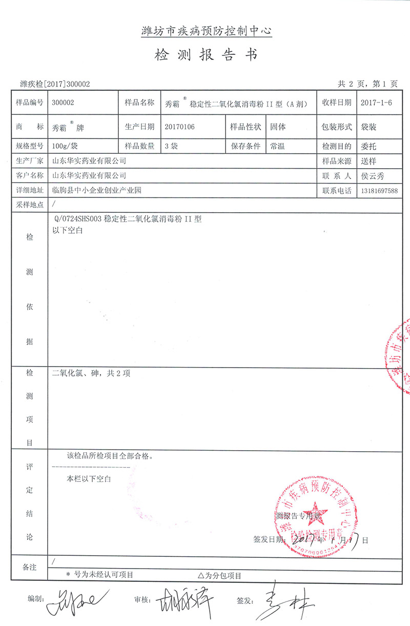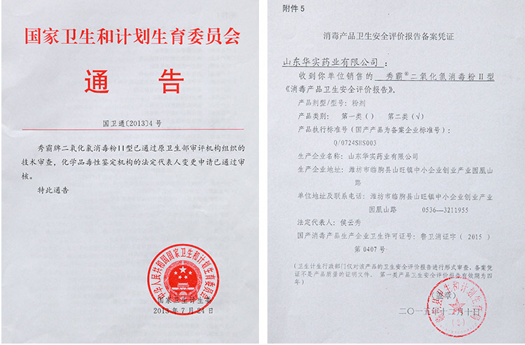 本产品是以二氧化氯为主要有效成分的二元装消毒粉,将A、B两剂剪开先后倒入水中(严禁将水倒入粉剂)可生产二氧化氯,A剂二氧化氯含量丙二元酸法48%±4.8%,B剂为配套活化剂;五步碘量法9%±0.9%。