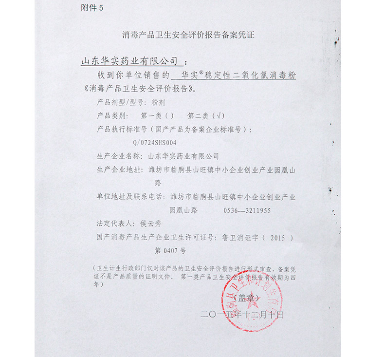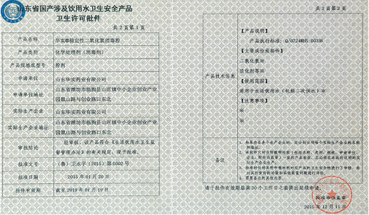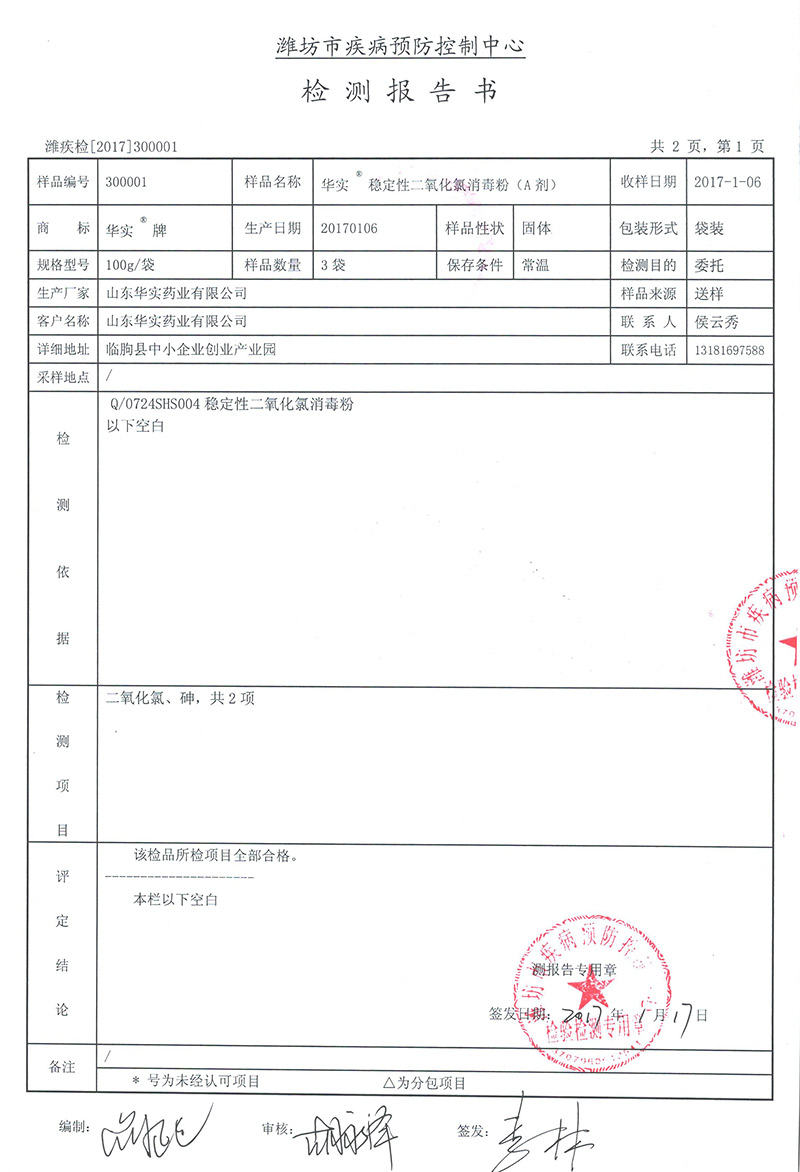 品牌:华实牌 类别:二氧化氯消毒粉剂 二氧化氯含量:40%±4%(一袋中分AB剂) 用途:食品加工专用 规格:800克/袋 价格:面议 运费:免运费本产品是以二氧化氯为主要有效成分的二元装消毒粉,将A、B两剂剪开先后倒入水中(严禁将水倒入粉剂)可生产二氧化氯,A剂二氧化氯含量丙二元酸法40%±4%,B剂为配套活化剂;五步碘量法8%±0.8%。